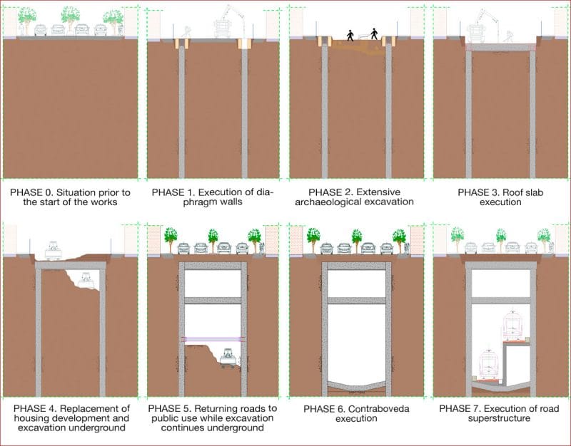 This methodology allows for the redevelopment of the affected surface areas and the return to public use as soon as the roof slabs are completed. This helps minimise disruption in sensitive and densely populated city central areas with significant commercial activity, such as this section.