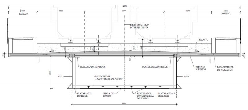 Las almas del cajón se disponen separadas 6,60 m con voladizos laterales de 4 m. La elección de la separación de las almas, además de para permitir disponer de vuelos laterales compatibles con la no utilización de elementos como costillas o jabalcones, se ha elegido de manera que los carriles exteriores de cada vía resulten casi coincidentes con las almas del cajón, limitando de este modo las solicitaciones transversales. En la parte exterior se rigidizan las almas del cajón con células inclinadas.