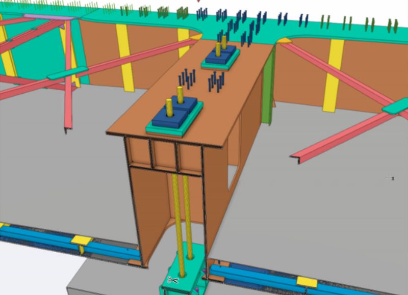Los mamparos de apoyos, formados por vigas de doble alma, permiten la conexión de las barras antisismo, dan continuidad a la losa de fondo, y se prolongan por el exterior para materializar la superficie de contacto con los topes sísmicos. Se han previsto una rigidización y unas chapas de transferencia, necesarias para realizar una futura sustitución de apoyos.